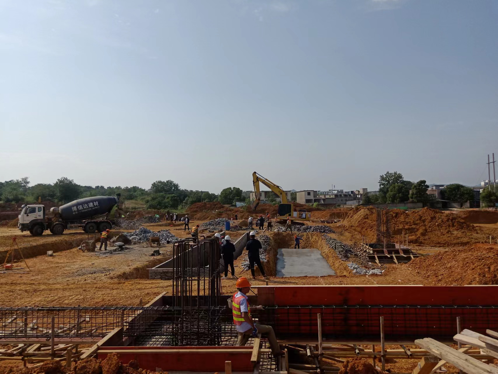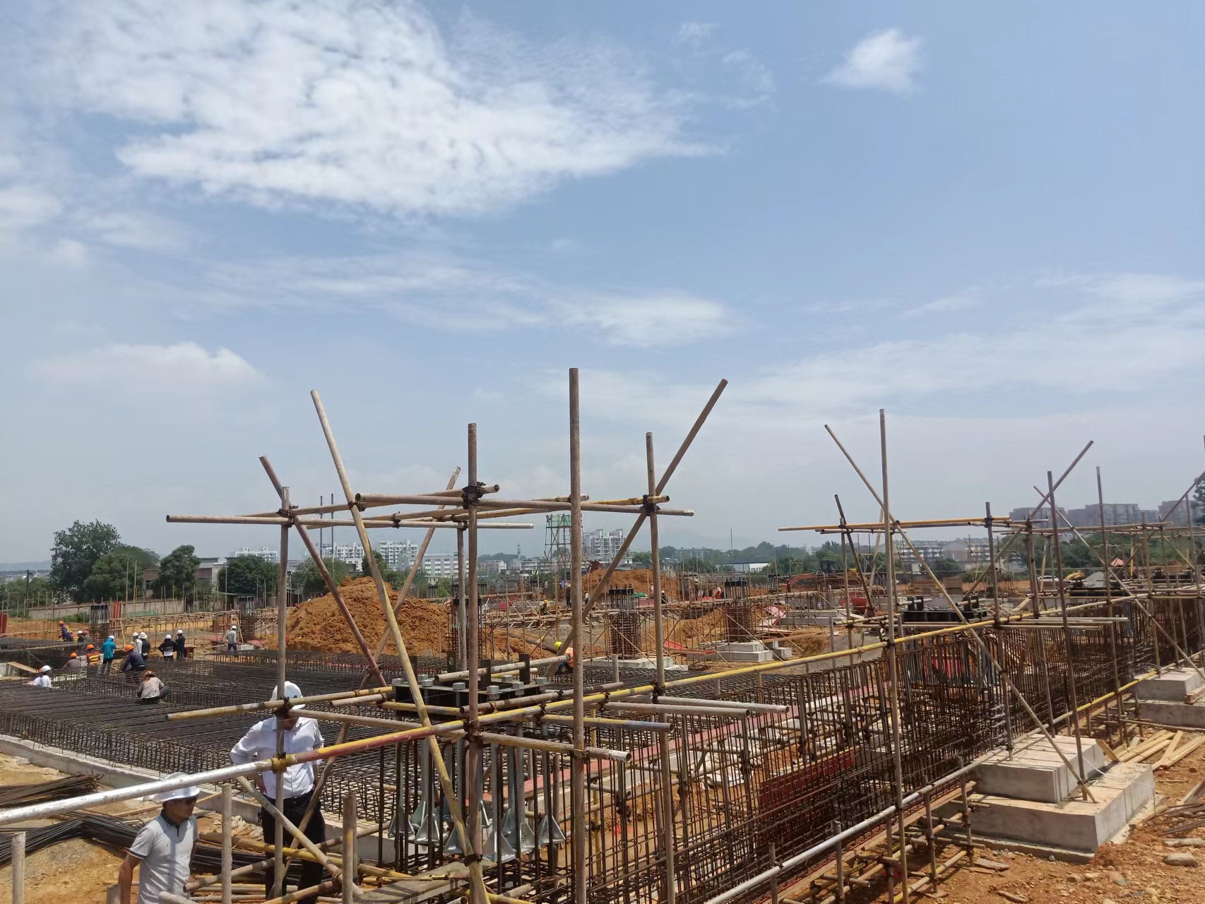 5月20日驕陽似火,新普電氣設備項目工地上呈現一片熱火朝天的施工場面,現場的工作人員正在進行緊張有序的灌樁工作。