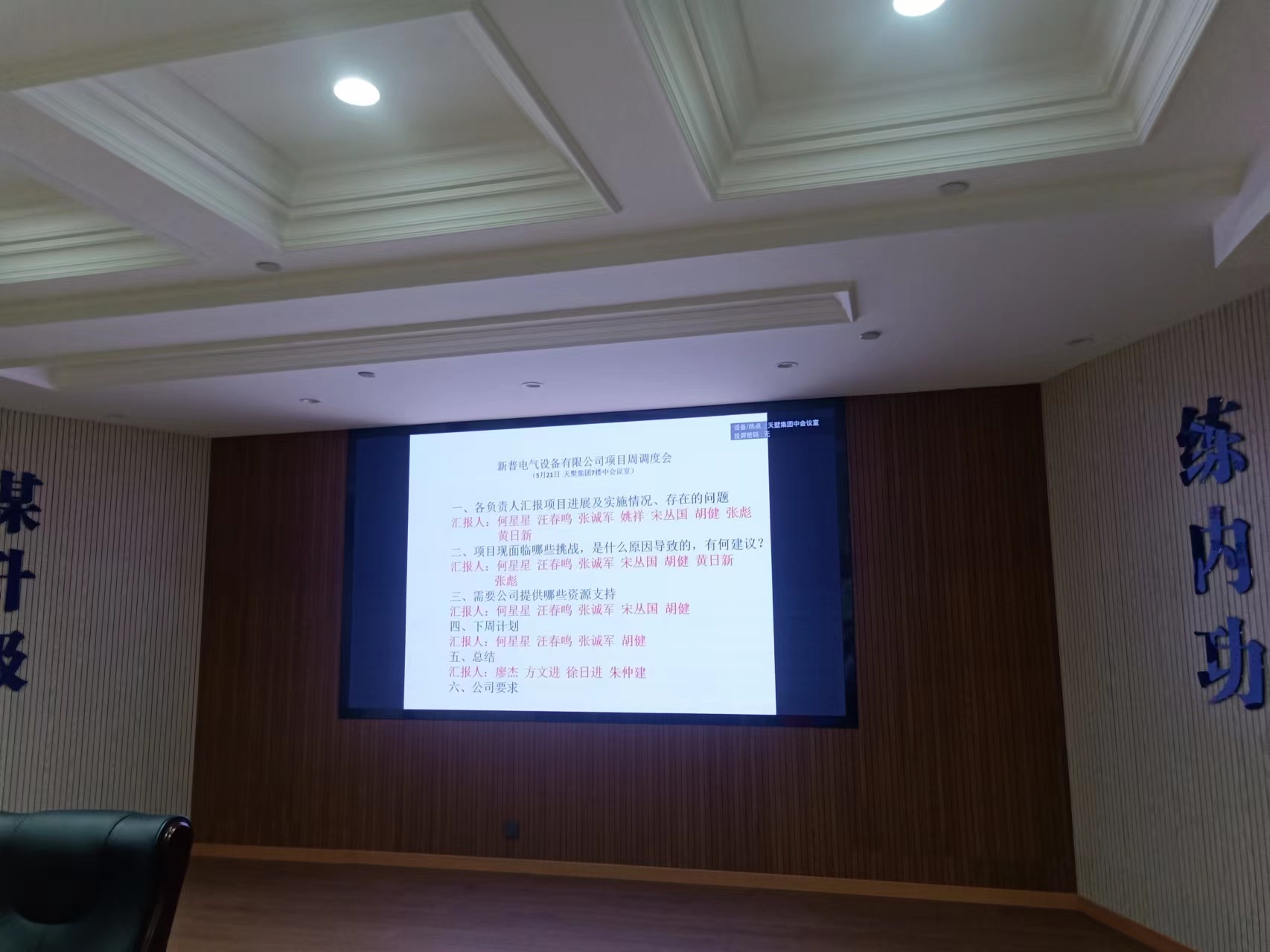5月21日晚上7點,總經理主持召開集團新普電氣項目推進會。項目經理、技術總工、生產經理等有關負責人參會。
