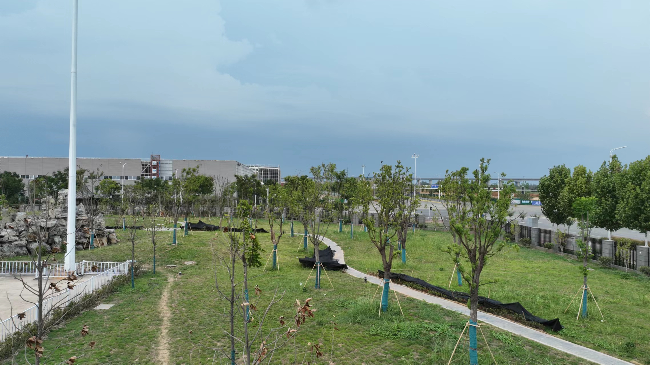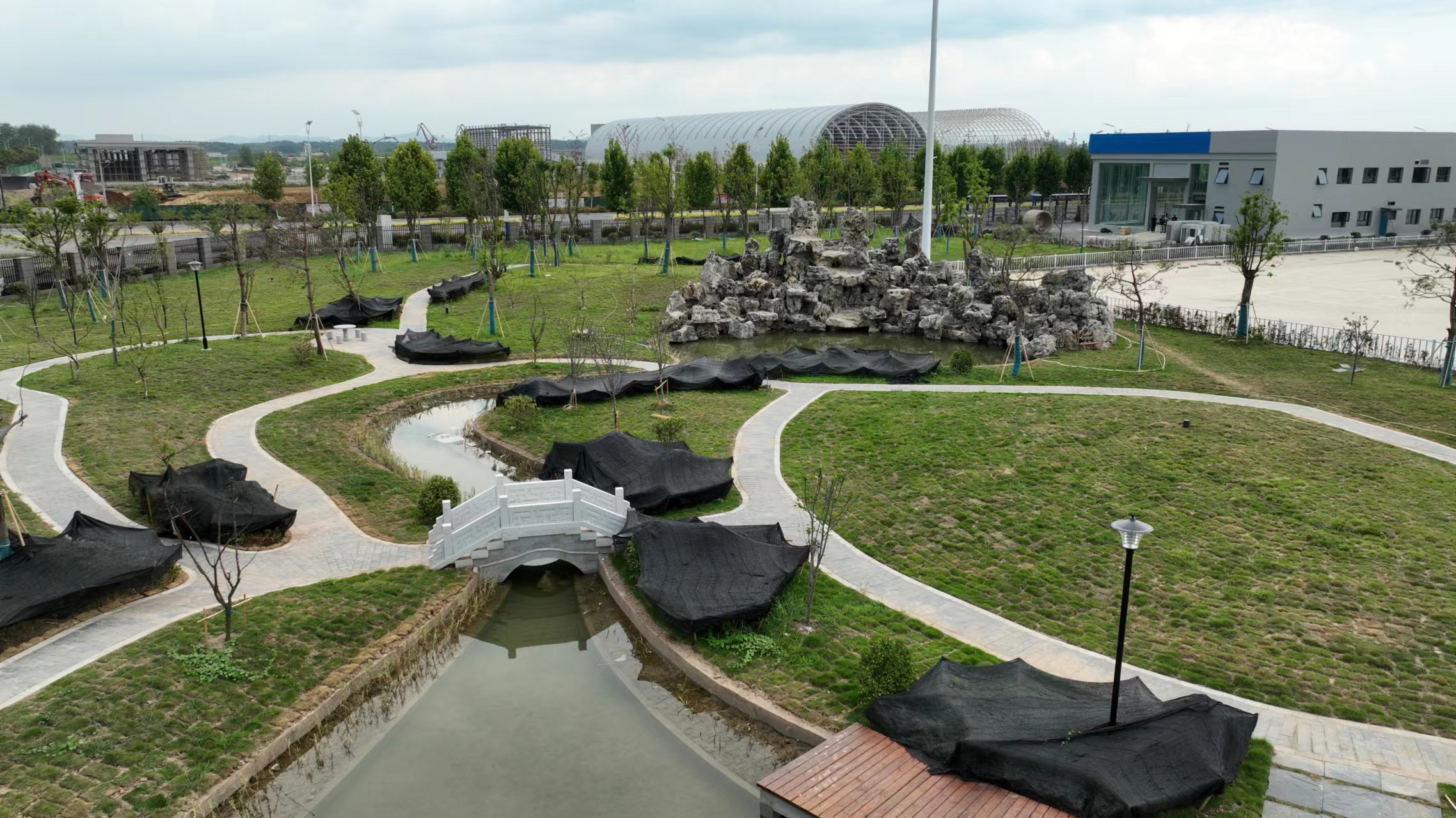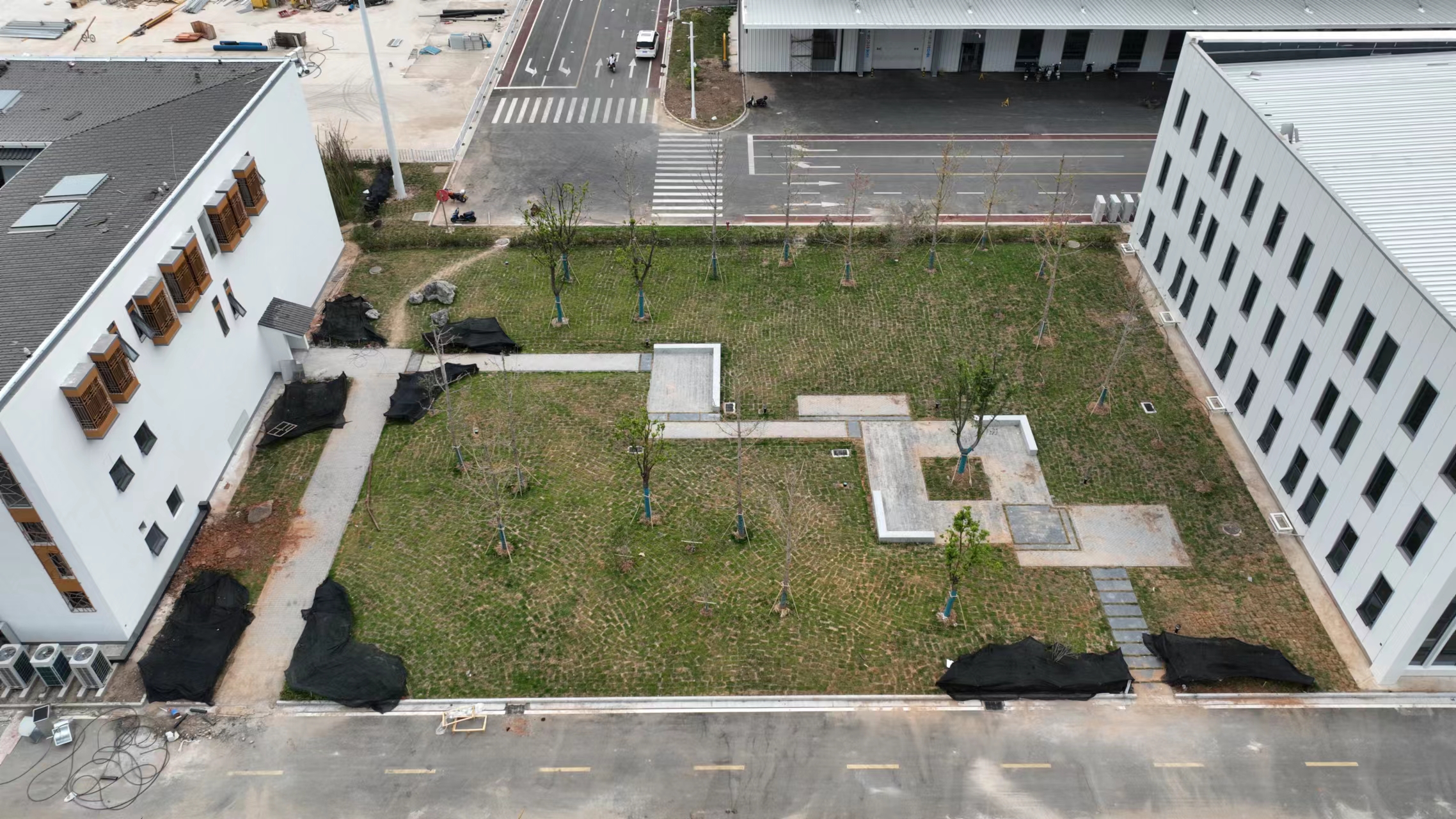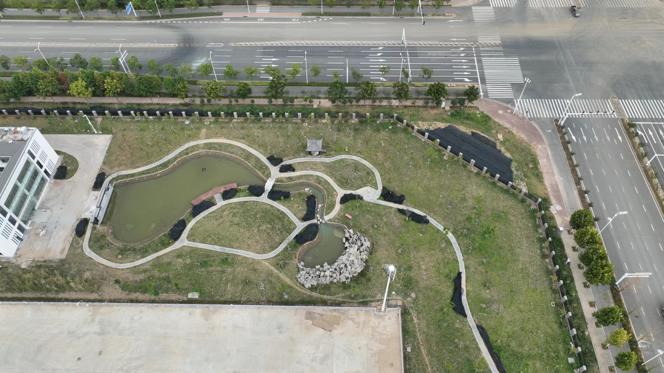 本項目于2022年5月10日正式開工,歷時三個月竣工,本項目主要施工內容為綠化覆蓋面積為50072㎡,硬質輔裝面積約5474.78㎡,停車位面積為1682.47㎡。