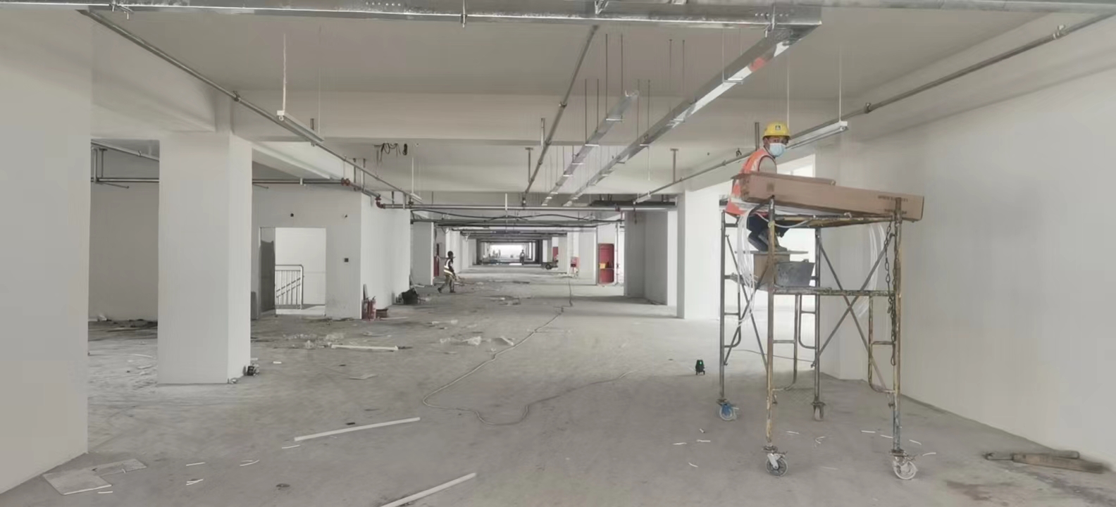 地下停車場改造施工現場,月份相比,工程已經初見雛形工人們有的在忙著吊頂有的在進行綜合橋架施工。據汪經理介紹工程主要包括消防管道、噴淋管道、火災報警器、空調系統和照明的安裝等。智能化工程包括智慧停車和反向尋車、廣播、門禁等。安裝工程、智能化工程這項工程在穿插進行中預計到9月底準備各類設備調試工作。