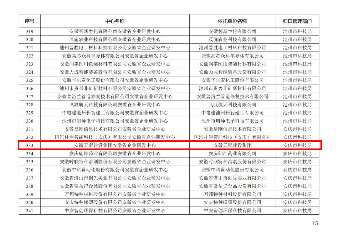 根據《安徽省企業研發中心建設認定工作指引(試行)》(皖科基地〔2023〕8號)和《關于開展2023年安徽省企業研發中心建設認定工作的通知》(皖科基地秘〔2023〕239號)要求,經通知發布、組織申報、各市審核推薦、形式審查和現場核查,并經廳務會議審議等程序,形成首批擬認定355家安徽省企業研發中心名單,其中安徽天墅集團成功入選,值得一提的是安慶市本次入選企業僅有17家。
