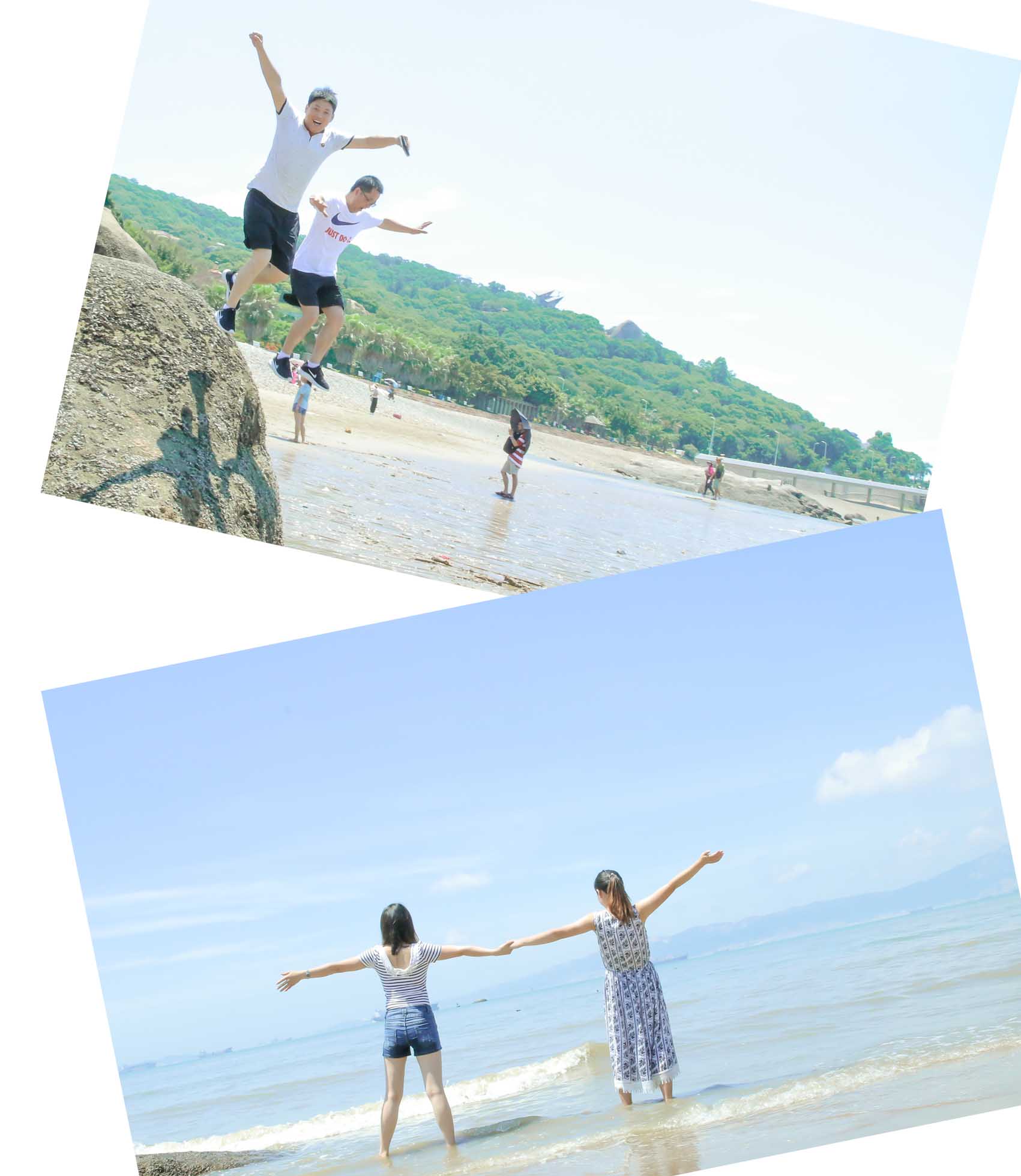 上面的同事則不停給我們這些水中‘健兒’拍照,我們也很配合的擺出各種姿勢,任由他們拍照,留下這一永恒的瞬間。沙灘上的所有女同事一刻也沒閑著,她們幾個人一對,有的相互追逐、打鬧,有的擺出飛翔式,有的擺出跳躍式,用鏡頭記錄這一美好瞬間。快樂的時光總是很快的。40分鐘的時間不知不覺很快就過去了,而很多同事仍意猶未盡,戀戀不舍的與我們的大海告別。
