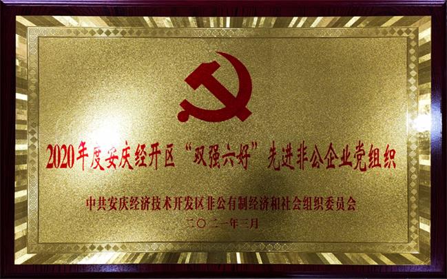會議最后通報了2020年度“雙強六好”非公黨組,并邀請個別先進非公黨支部書記做2020年度黨務工作述職。集團公司喜獲2020年度安慶經開區“雙強六好”先進非公企業黨組織稱號,經開區非公黨委書記儲江為公司頒發榮譽獎牌。