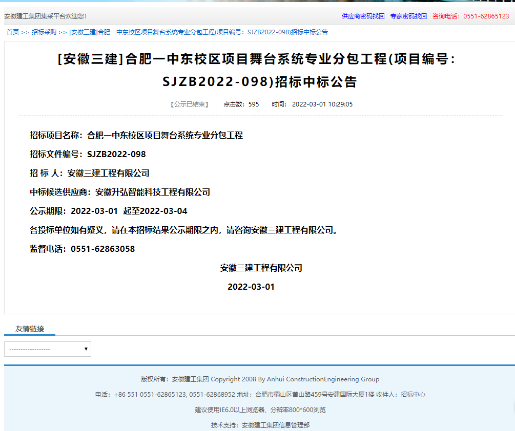 升弘公司中標合肥一中東校區項目舞臺系統專業分包工程項目