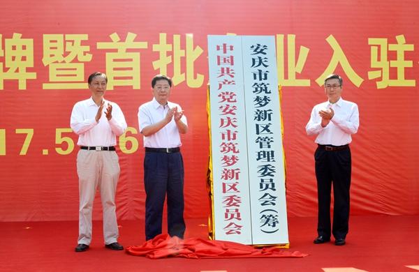 2017年5月26日上午,新區(qū)揭牌暨首批企業(yè)入駐儀式在安慶智慧產(chǎn)業(yè)園廣場隆重舉行。活動由市委常委、常務(wù)副市長張君毅主持。市委書記魏曉明、市長陳冰冰、市人大主任康正和為中共安慶市筑夢新區(qū)委員會、安慶市筑夢新區(qū)管理委員會(籌)揭牌;董磊副市長致辭,并與入駐企業(yè)代表共同開啟企業(yè)集中入駐啟動球。市領(lǐng)導(dǎo)劉大群、陳愛軍、宋圣軍、華克思、周東明等出席活動。
